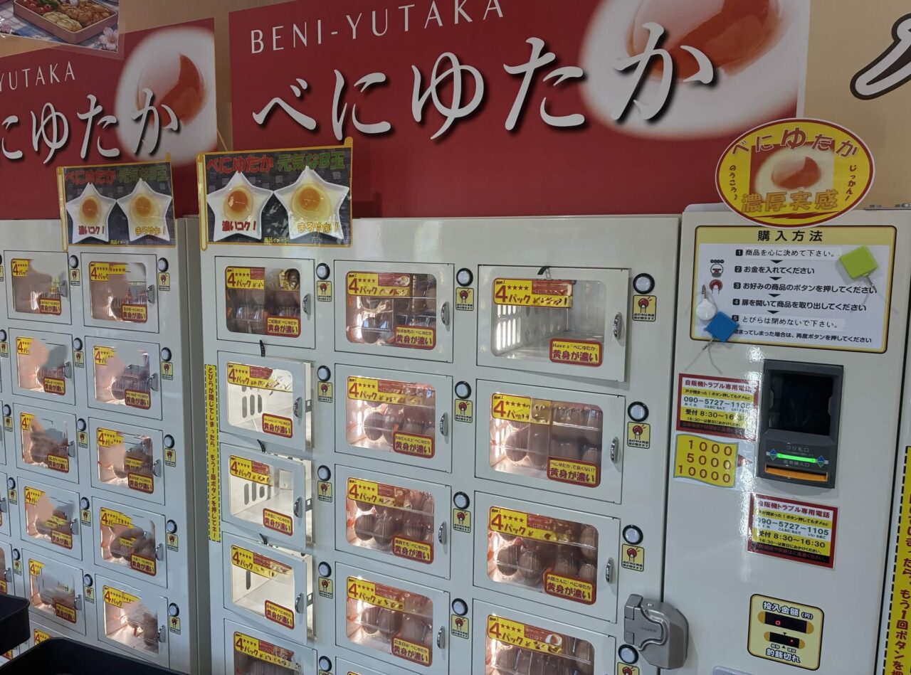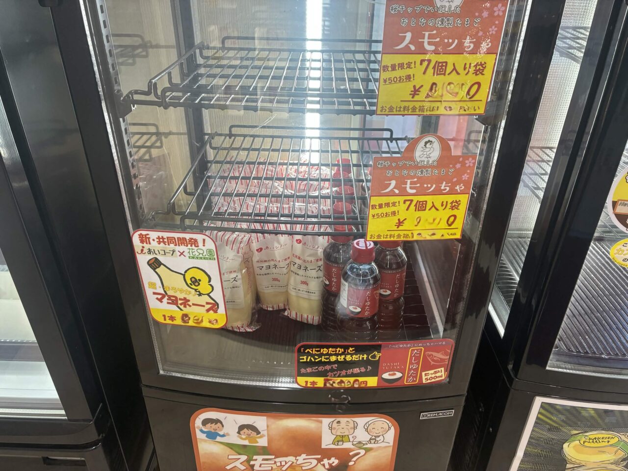 加工品の入った冷蔵・常温の自販機では、たまごぷりん・シフォンケーキ・アイスのほか、くんせいたまご「スモッちゃ」、調味料(アミノ酸)不使用の花たまごマヨネーズ、たまごごはんのタレ「だしゆたか」などが並んでいます。